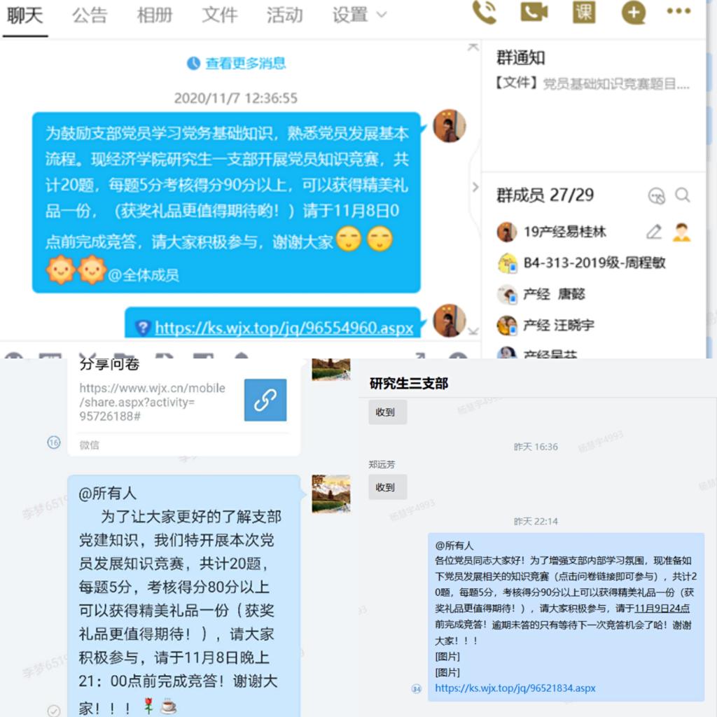 2020年11月5日,公司研究生一、二、三党支部共同举办了党员发展相关的知识竞赛,采用问卷答题的形式,各支部书记及全体党员参加了此次活动。