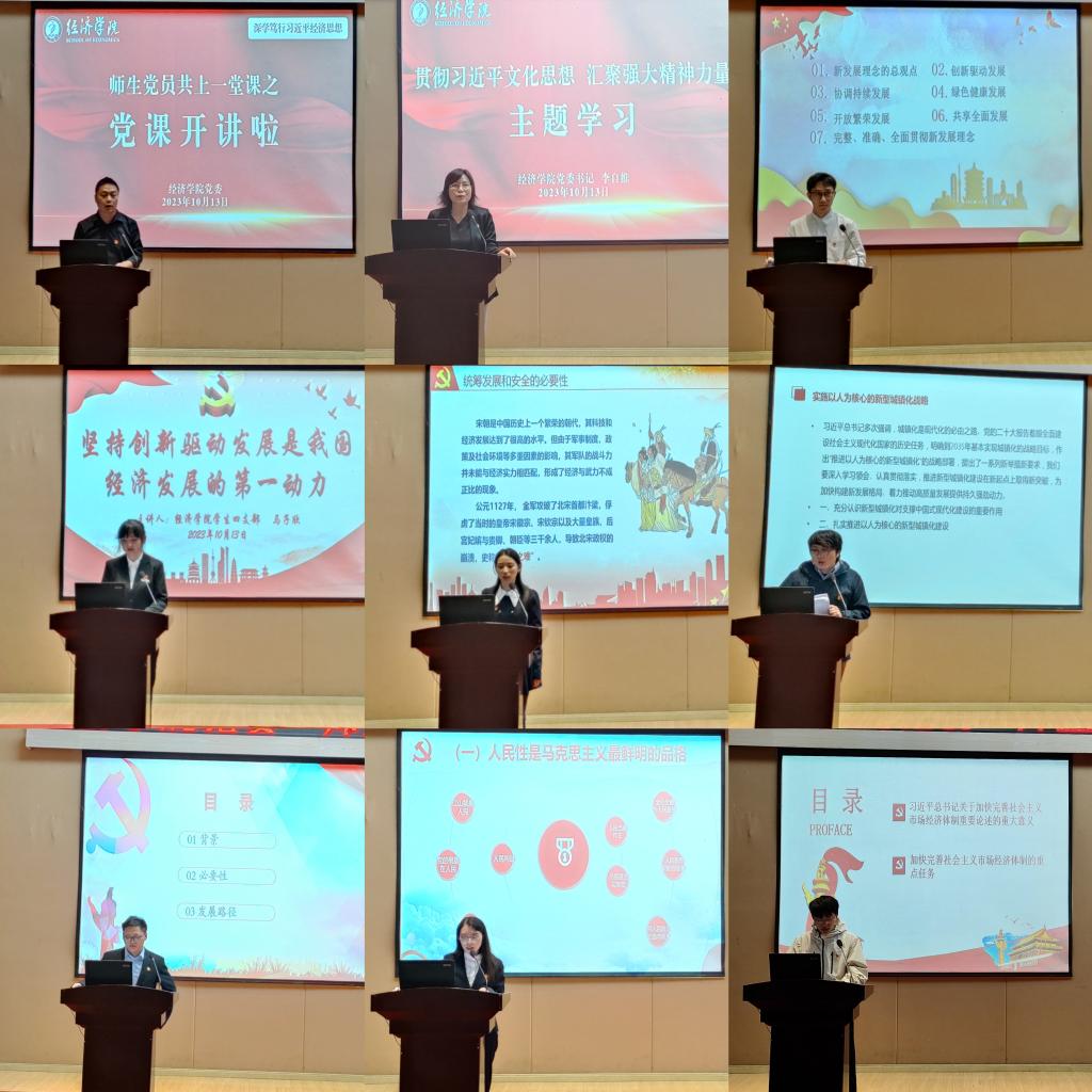 随后,7名师生党员围绕习近平经济思想展开宣讲。员工三支部陈达同学深入阐释了贯彻创新、协调、绿色、开放、共享的新发展理念的重要意义;员工四支部马子欣同学围绕“坚持创新驱动发展是我国经济发展的第一动力”,介绍了创新驱动发展的案例、原因和措施;教工三支部刘霜老师讲述了统筹发展和安全的必要性、阶段性成果、面临的挑战,强调了坚持总体国家安全观,统筹发展和安全,防范化解重大安全风险的重要性;教工四支部张充老师讲述了新型城镇化对支撑中国式现代化建设的重要作用,以及如何推进以人为核心的新型城镇化战略;教工五支部车四方老师围绕大力发展制造业和实体经济,深入阐述其背景、必要性和实现路径,强调坚持制造业高质量发展目标,走制造业高质量发展之路;研究生三支部蒋依伶同学阐述了我国经济发展的根本立场,即坚持以人民为中心,在发展中保障和改善民生,坚定不移走共同富裕的道路;研究生四支部何建同学深入分析了在全面建设社会主义现代化国家的新征程上,要坚定不移深化市场化改革,加快完善社会主义市场经济体制。