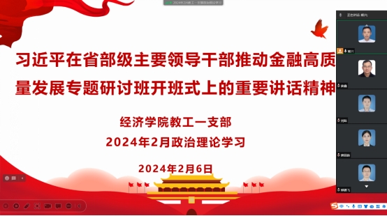 2024年2月6日,公司教工第一支部通过企业微信开展二月组织生活,集体学习习近平总书记在省部级主要领导干部推动金融高质量发展专题研讨班开班式上的重要讲话。