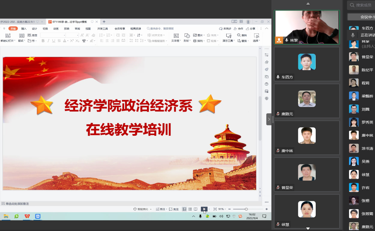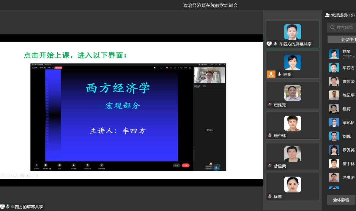 为强化教师线上教学技能,确保新学期线上教学顺利开展。9月4日,政治经济系召开了线上教学技能培训会。会议由系主任林黎副教授主持,车四方博士主讲,政治经济系全体教师参加会议。