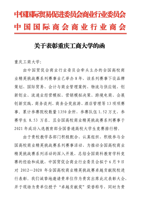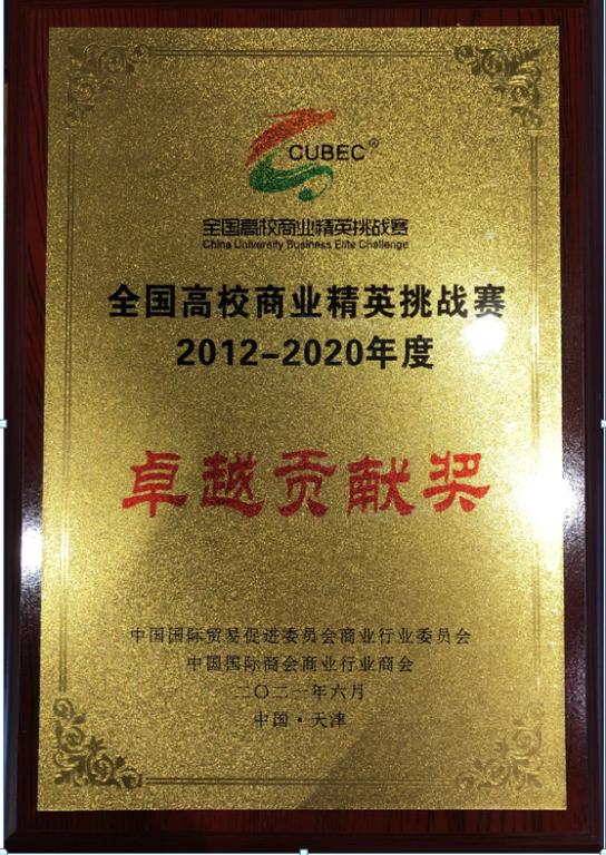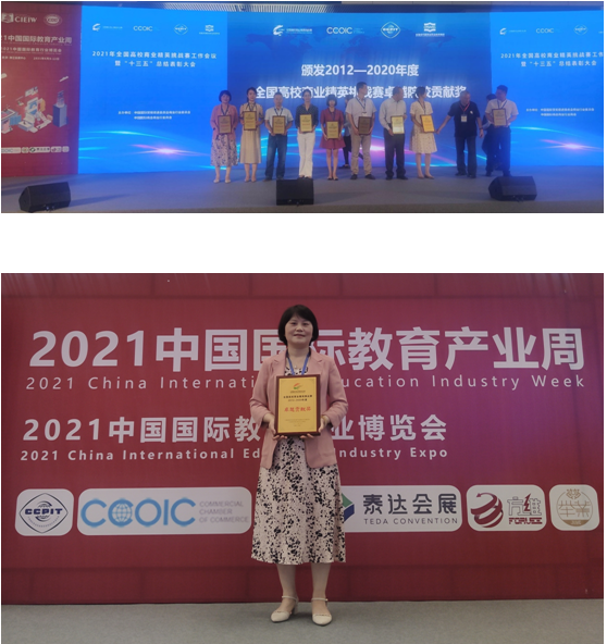 由中国国际贸易促进委员会商业行业委员会、中国国际商会商业行业委员会主办的“2021中国国际教育产业周”活动6月9日-11日在天津梅江会展中心举行,全国高校商业精英挑战赛工作会议暨“十三五”总结表彰大会同期举行,会上对2012-2020年全国高校商业精英挑战赛做了工作总结和表彰。鉴于公司国贸团队在该赛事中的卓越表现,被授予“卓越贡献奖”,英国上市公司365国贸系主任蒋兴红副教授代表团队领奖。