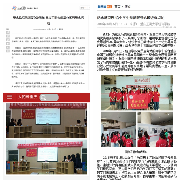 英国正版365官方网站公司党员服务站举办的一系列纪念马克思诞辰200周年的纪念活动收到新华网、华龙网、人民网∙重庆等媒体报道,旨在通过类似形式多样的学习活动,让同学们更加坚定理想信念,承担起新时代赋予其的历史重任,成长为报效祖国的有用之才!