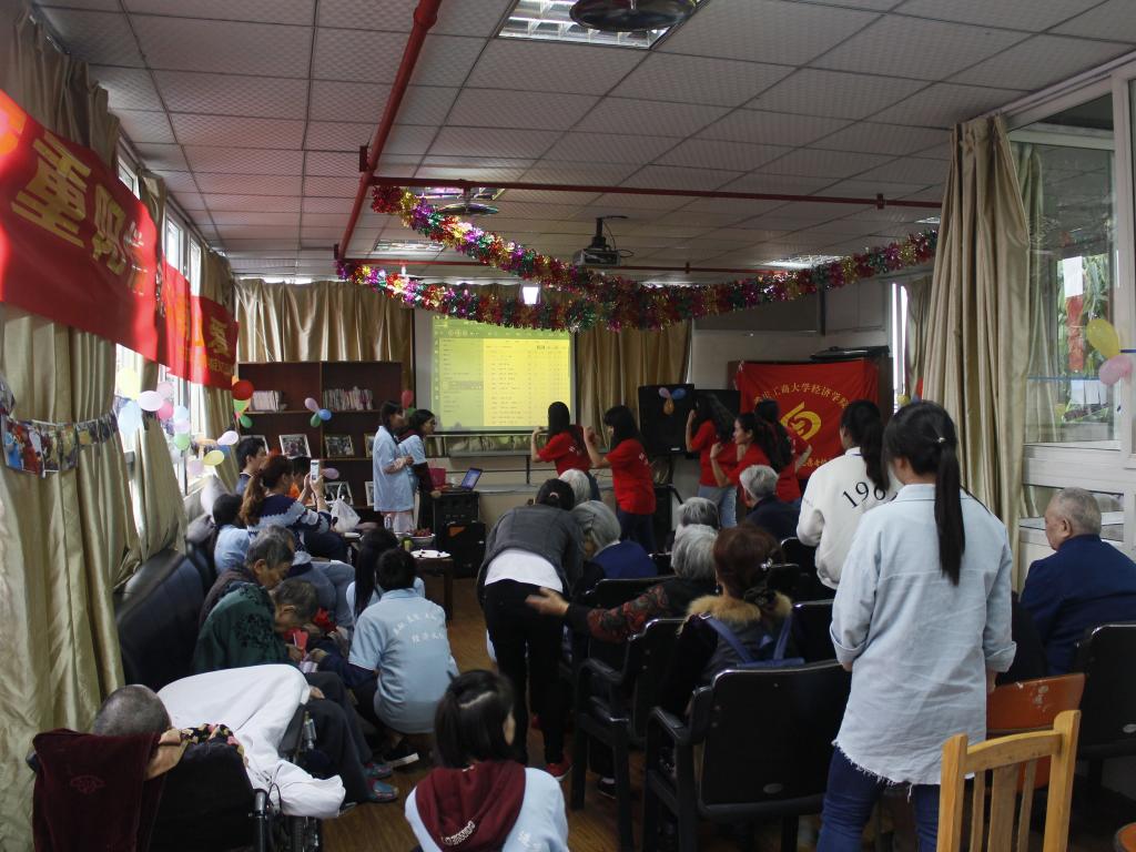 刚到敬老院同学们便立即的行动起来,布置现场,分组为老人们打扫院子,整理房间,给老人们按摩、捶背。他们唱歌跳舞,表演小品,满怀热情地走到老人的身边,和老人们一起折纸玩耍,嘘寒问暖,听老人们讲述自己的故事,同学们纯真的表情,亲切的话语,使得老人们乐不可支,其乐融融。同学们的努力给老人带来了喜悦、幸福和满足。看到老人们脸上洋溢的灿烂笑容,他们也会心地笑了,整个敬老院充满了欢声笑语。