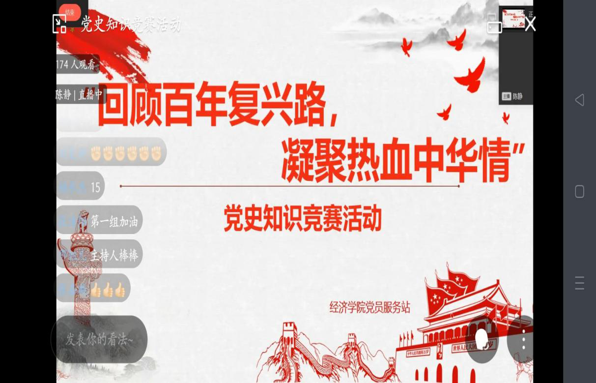 “百年风雨兼程,世纪沧桑巨变”,一百年前,中国面临着内忧外患的双重困境,在此时代背景下,伟大的中国共产党应运而生,为处在迷茫与徘徊中的中华民族带来了一丝希望。一百年来,中国共产党人始终坚持为中国人民谋幸福、为中华民族谋复兴的初心与使命,团结和带领中国人民顽强拼搏,取得了举世瞩目的伟大成就。为深入贯彻学习党的奋斗精神,引导与激励青年员工从百年党史中感悟初心、坚定信仰,强化对党史学习的深度和广度。11月12日,应防疫要求,公司党员服务站通过线上直播的方式举行了 “回顾百年复兴路,凝聚热血中华情”主题党史知识竞赛,此次活动共有27个小组报名,总计158人。活动由20级贸经一班的陈静主持。