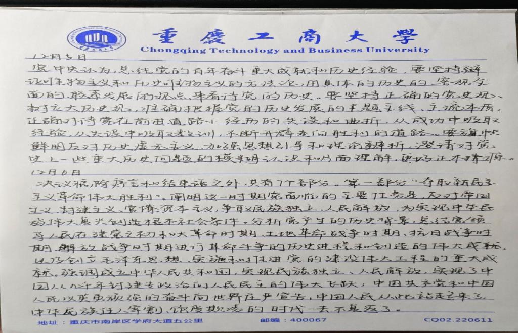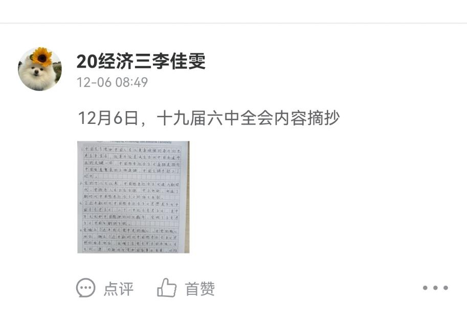 通过对十九届六中全会精神的学习,站员们感触颇深。20级财政二班的李泽琪认为“治国有常,而利民为本”,在学习打卡的过程中站员们自身的思想意识得到了强化,坚定了对党忠诚、一心向党的信念。同时表示自己会更加努力学习科学文化知识,争做国家建设者与党的接班人;20级税收二班的冯琼玲表示此次线上打卡活动,让大家更加深入地了解了十九届六中全会的会议精神,从百年伟大征程中汲取历史经验,有利于站员们将自身与国家和社会的前途命运紧密联系结合,与时代同频共振,为实现第二个百年奋斗目标贡献青春力量;20级税收二班的周宇铃指出“以史为鉴,可以知兴替”,进入新的历史阶段,新时代青年需要学史明理,学史崇德,学史增信,强化心中信念,提高自身素质,为实现中华民族伟大复兴的中国梦贡献一份青年力量。