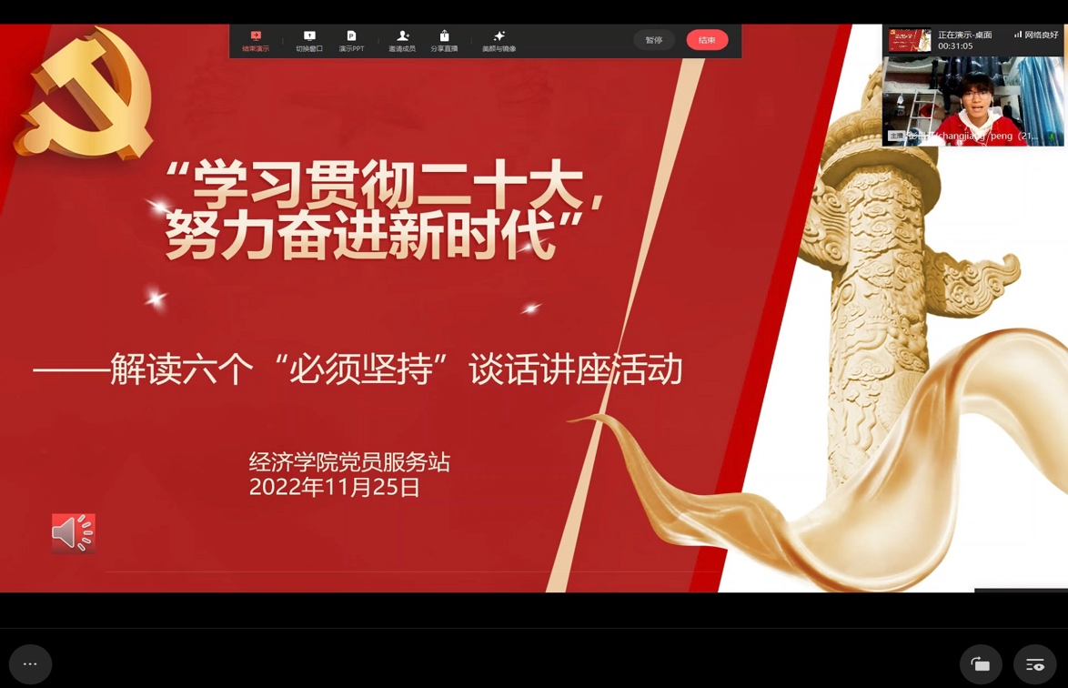 党的二十大报告首次系统阐明了习近平新时代中国特色社会主义思想的世界观和方法论,即六个“必须坚持”:必须坚持人民至上、坚持自信自立、坚持守正创新、坚持问题导向、坚持系统观念、坚持胸怀天下。为进一步学习贯彻二十大精神、正确理解六个“必须坚持”的重要意义,公司党员服务站于11月25日通过线上直播的形式举办了“学习贯彻二十大,努力奋进新时代”——解读六个“必须坚持”谈话讲座主题活动。本次活动由21级财政一班杨天瑞同学主持,经济党服一百余名站员参与其中。
