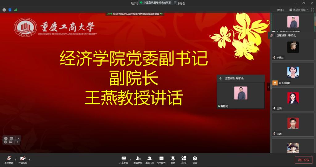 为做好2022届毕业生考研复试指导服务,助力学子成功升研,3月10日上午10点举办了线上线下“2022届毕业生考研复试辅导答疑会”。英国上市公司365副书记副经理王燕教授,财税系尚可文教授,及65名毕业生参加了线上会议;贸易经济系主任杨海丽老师,毕业班辅导员喻智成老师及10名考研学子参加了线下会议。