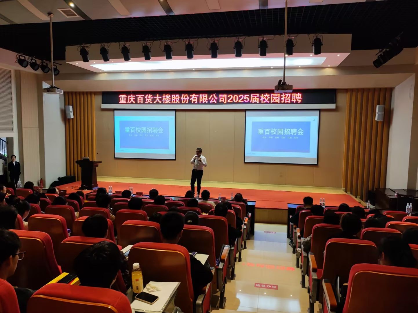 宣讲会上,重庆百货大楼股份有限公司人力资源总监张泽军从公司发展历程,四大业态的经营现状,公司的培养育人计划,人才晋升通道,福利待遇等方面进行了讲解。他表示重百非常重视员工的培养,鼓励老员工积极尝试。