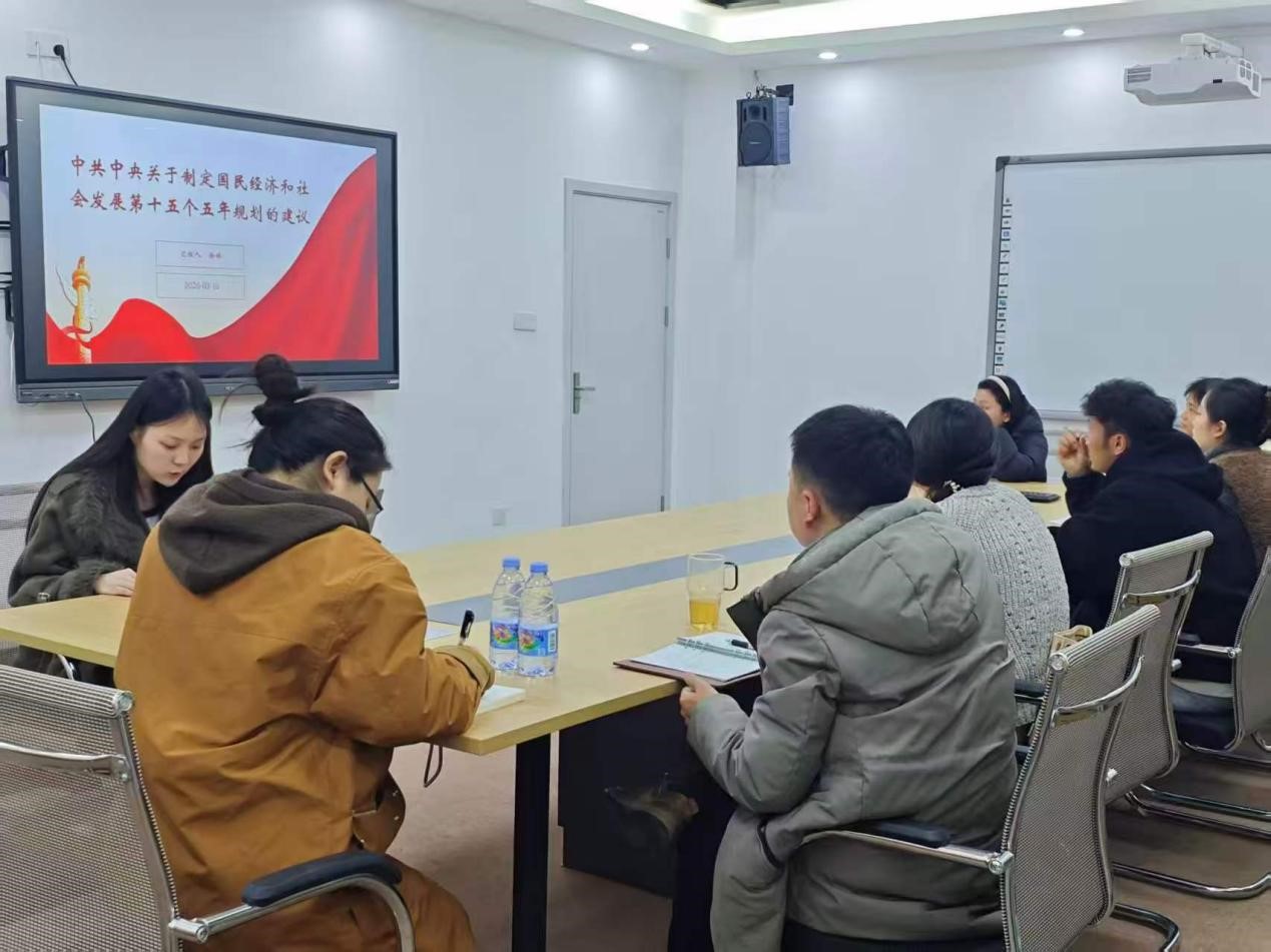紧接着,支部成员徐婷同志聚焦《中共中央关于制定国民经济和社会发展第十五个五年规划的建议》,围绕“十五五”时期的历史方位、指导思想、战略任务和保障措施展开系统讲解。她系统回顾了“十四五”时期我国在经济结构、科技创新、生态文明、民生福祉、改革开放等方面取得的重大成就,分析了“十五五”时期面临的新发展格局与战略机遇。她从实现高水平科技自立自强、建设现代化产业体系、构建区域协调发展新格局、深化改革开放四大关键领域入手,详细阐释了“十五五”规划的战略任务,并结合党的全面领导、法治保障、营商环境优化三大保障措施,强调规划落地落实的重要意义,帮助党员同志们准确把握国家发展蓝图与实践路径。