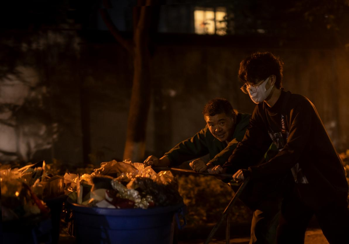 帮助环卫工人一起推垃圾车,希望在疫情期间,能在校内传递正能量,帮助他人,同时注意防护,希望能团结一致,齐心协力,疫情快快退去。