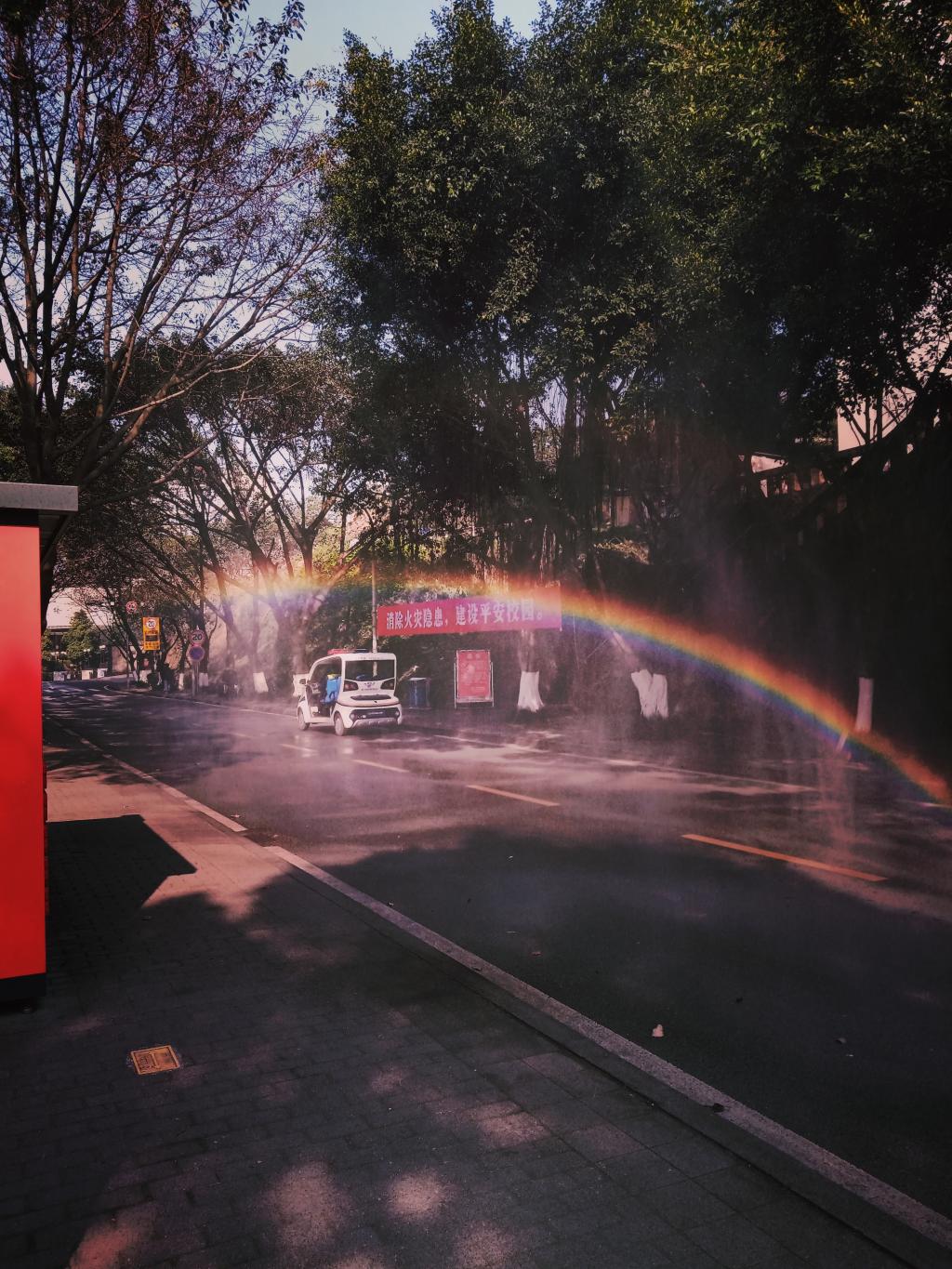 作品拍摄于公司翠湖路,公司工作的洒水车在午后的阳光下影射出一道彩虹的色彩。在严酷疫情的当下生活依旧充满希望,相信疫情终会有“疫晴”的一天,这一道彩虹传达美好的祝福,希望疫情早日结束。