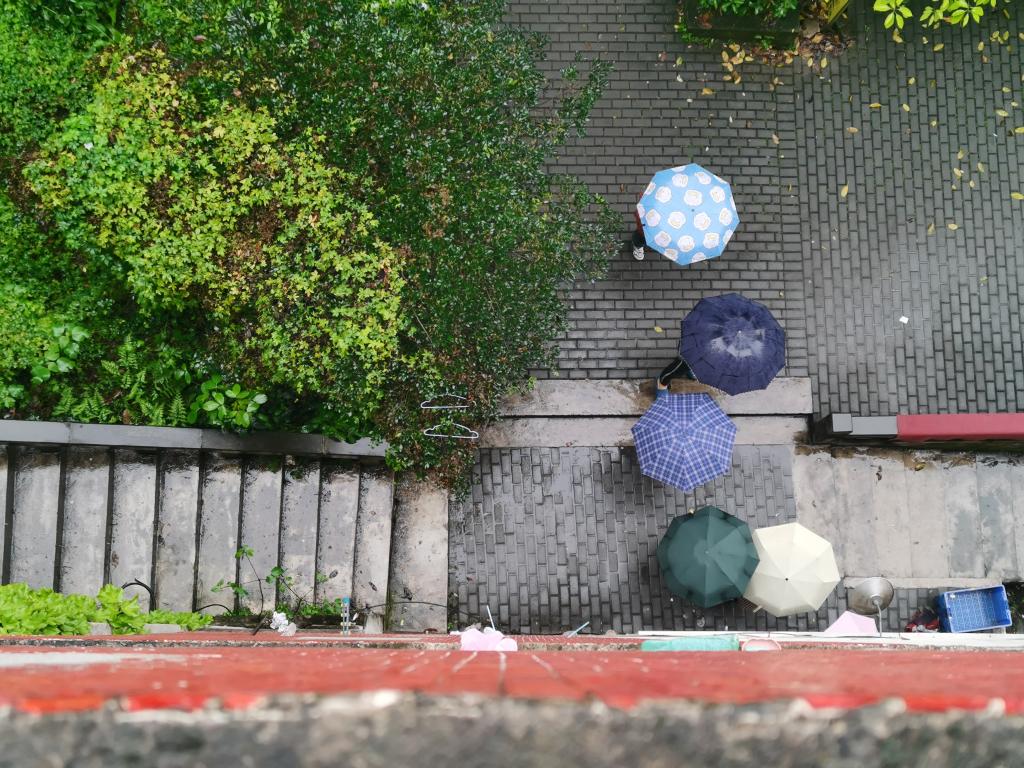 春雨绵绵,雾气笼罩,我听到雨声轻轻落在树叶上的声音,看到充满生机的一片绿。从阳台往下望,红色的墙边与青色的砖瓦静静的立在那里,一个个员工撑着不同色的伞缓缓经过。画面便增添了更多色彩。