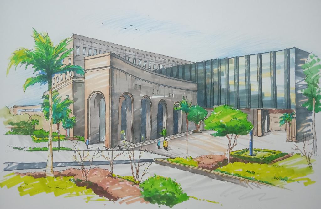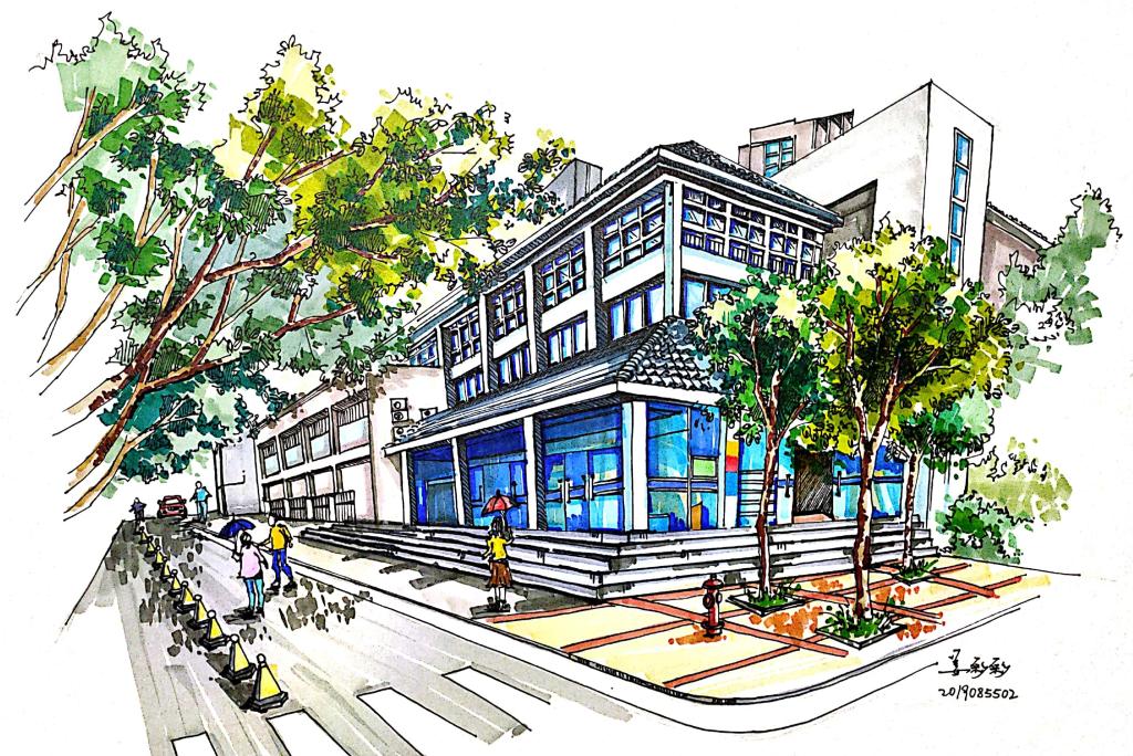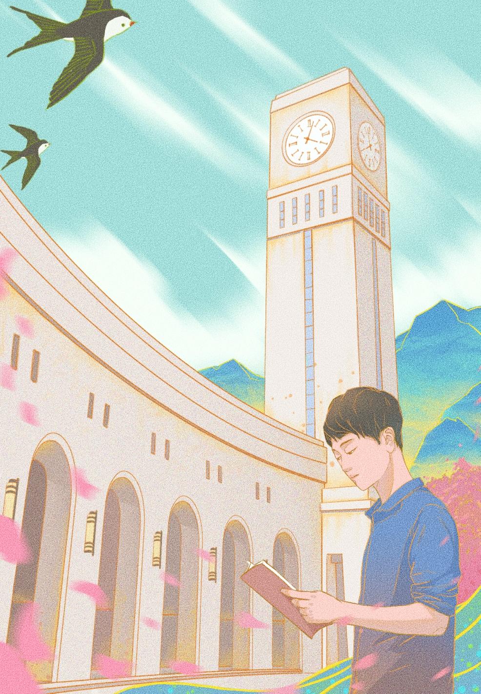 绘画作品灵感取材来源于公司的标志性建筑图书馆,燕子和桃花表现春日时节,图书馆前同学看书表现春日疫情下同学们学习情形。