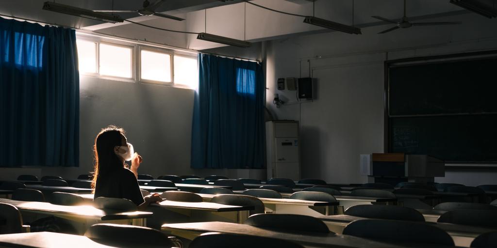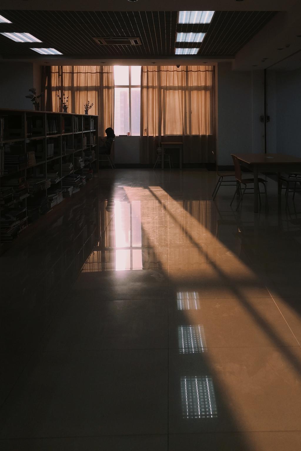 的图书馆,一束夕阳照映在地板上,仿佛也照射在了我的心尖上,将一天的疲惫都给冲散,而因为疫情带给我的种种烦恼也同落日一般消隐。