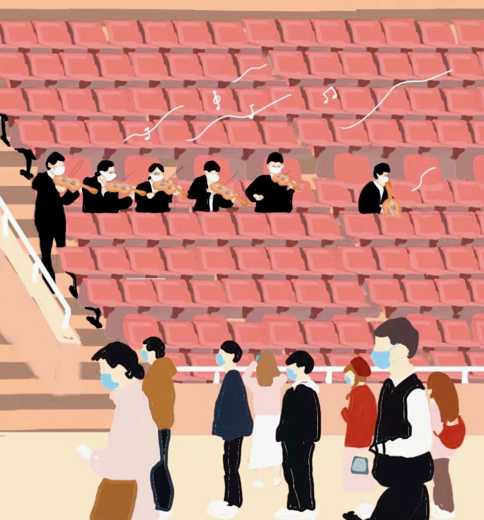 作品灵感来源于上海海事大学党员拉小提琴为同学“驱赶”检测核酸排队时的烦躁。表达了1、党员干部积极作为2、人性化管理与关怀3、员工积极向上的心态