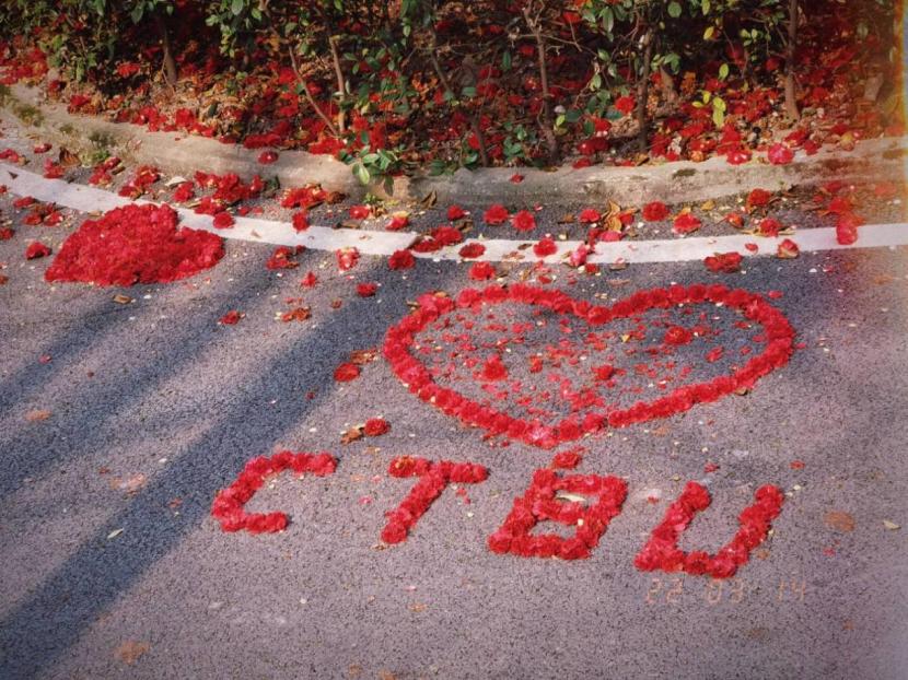 傍晚,太阳西去,金色的彩霞为它送行,给校园镀上一层华丽的金。教学楼前的树挂几束红色的花蕾。在落日余辉中,花儿争相绽放,与图书馆的钟交相辉映;花儿自然凋零,落花拼成CTBU恰到好处。爱意东升西落,浪漫至死不渝。