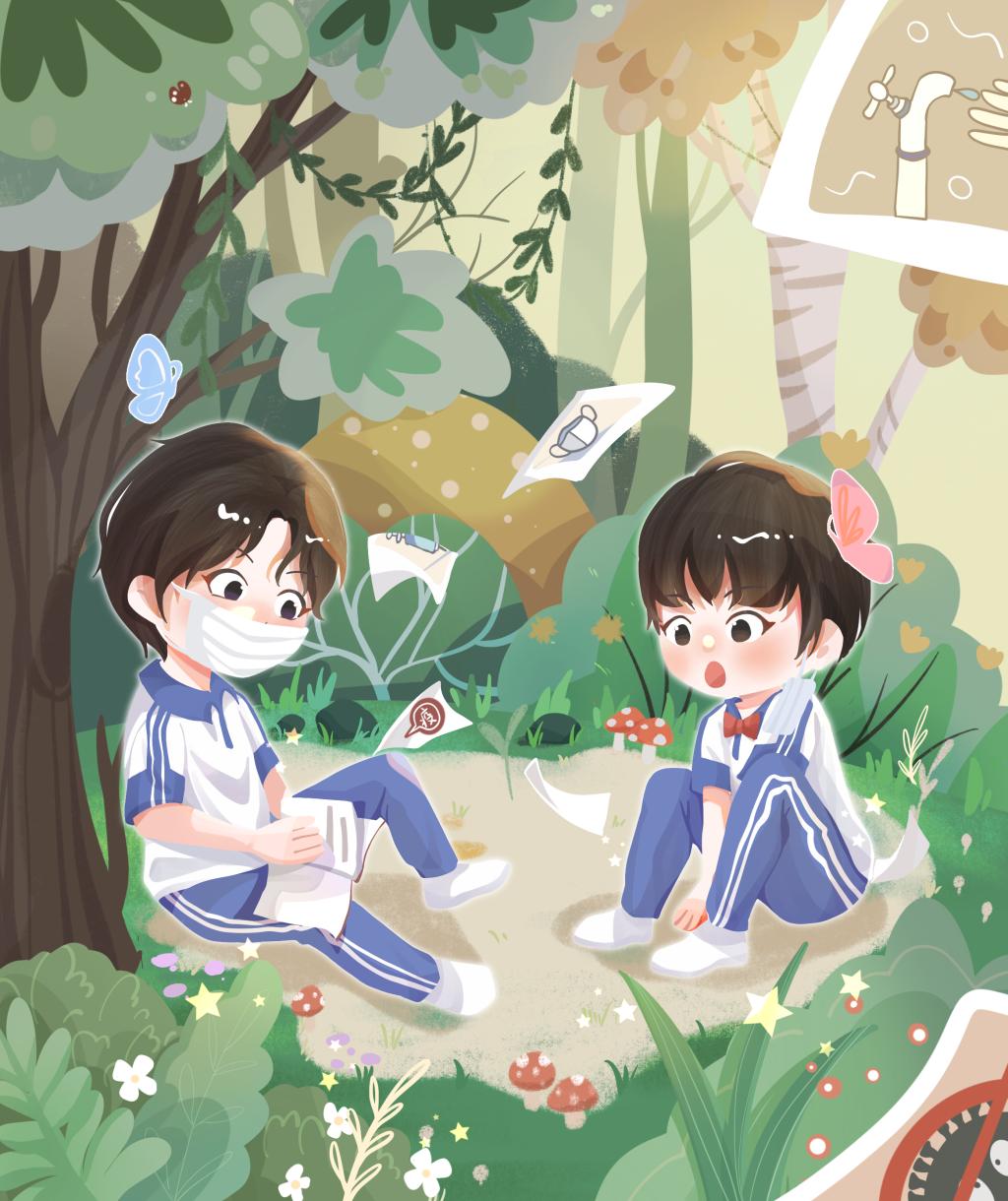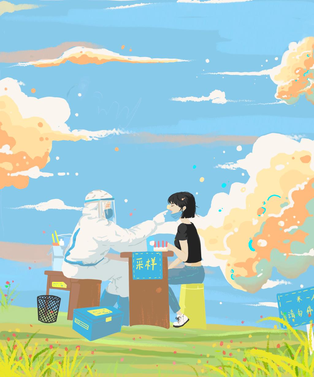 作为工商大学核酸检测的志愿者之一,在我的印象里,抗疫和防疫都是彼此配合,共同守护的暖心场景,因此我的防疫插画将校园的背景换成了治愈风格的草原。