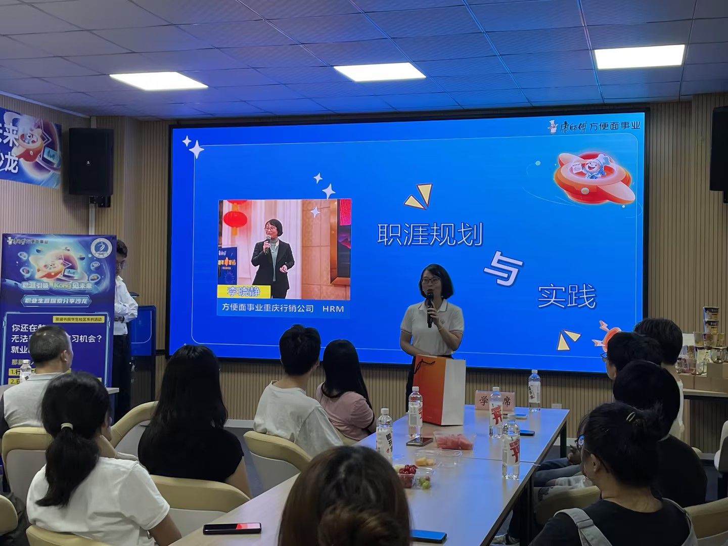 重庆康师傅方便面行销公司市品处徐敏经理进行“如何才能不能输给这个时代”的演讲,以通俗易懂、幽默的语言,以奥运会奖牌类比,介绍康师傅品牌;并以杰出企业家雷军为例,希望同学们学习其开阔的眼界,找寻人生成长动能,加强学习,增强工作本领;以身边同事28年职业经历,表明选择和努力同样重要,从职业生涯发展过程中执行力、规划力、思考力等核心竞争力的变化,强调了结构化思维与学习能力的重要性,最后表达了对各位同学加入康师傅的期待。