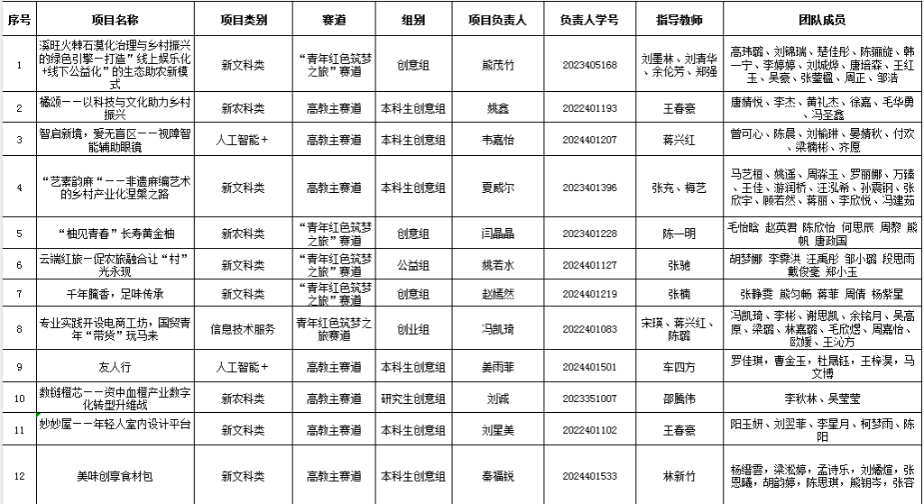 本次大赛自4月启动以来,吸引了全院101个创新项目报名,赛事历经项目征集、导师指导、初赛筛选等环节。公司邀请的评委从创新维度、商业维度、社会价值维度等多个方面进行了严格评审,评审出一等奖12项、二等奖38项、三等奖61项,获奖项目覆盖人工智能、乡村振兴、绿色经济等领域,最终推荐《溪旺火棘石漠化治理与乡村振兴的绿色引擎—打造"线上娱乐化+线下公益化”的生态助农新模式》《智启新境,爱无盲区——视障智能辅助眼镜》等12个项目角逐校赛。