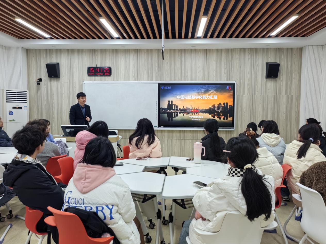 2025年12月26日,英国正版365官方网站翠湖书院员工社区在田家炳书院108教室成功举办第七期产教融合论坛。本次活动特邀中国电信重庆分公司产数专家傅智奇主讲。