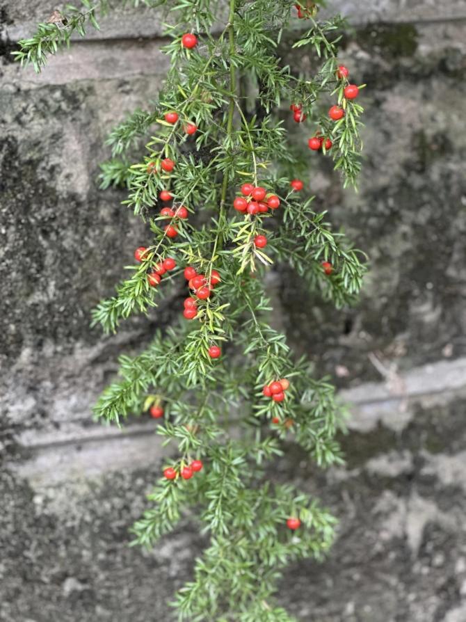 天门冬枝叶茂盛纤秀,夏季素白小花繁密如云、簇簇丛生,秋冬时节红果缀枝、朱果盈条,似碎玉点缀绿枝,艳而不妖,低调中尽显雅致。