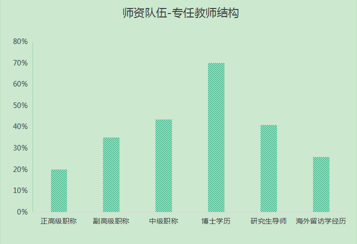 教师中正高级职称19人,占比19.59%,副高级职称33人,占比34.02%,中级职称45人,占比46.39%;具有博士学位的教师79人,占比81.44%;博士生导师3人,硕士生导师49人,导师人数占比50.52%;有海外访学经历的教师22人,占比22.68%。